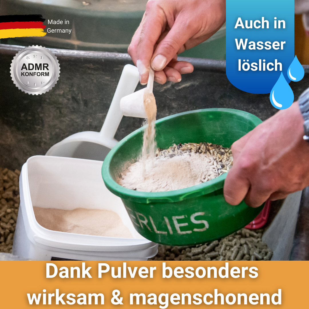 Für uns ist das nicht nur ein Werbespruch. Dank unseren Pulverrezepturen kommt reiner Wirkstoff schnell und schonend bei deinem Pferd an, natürlich und ohne Industriezucker!