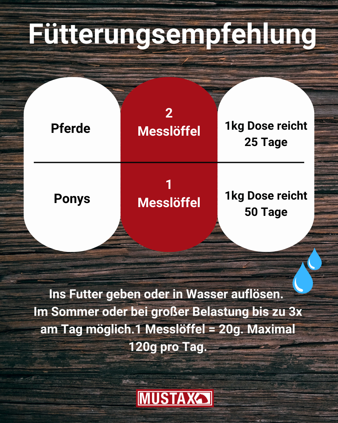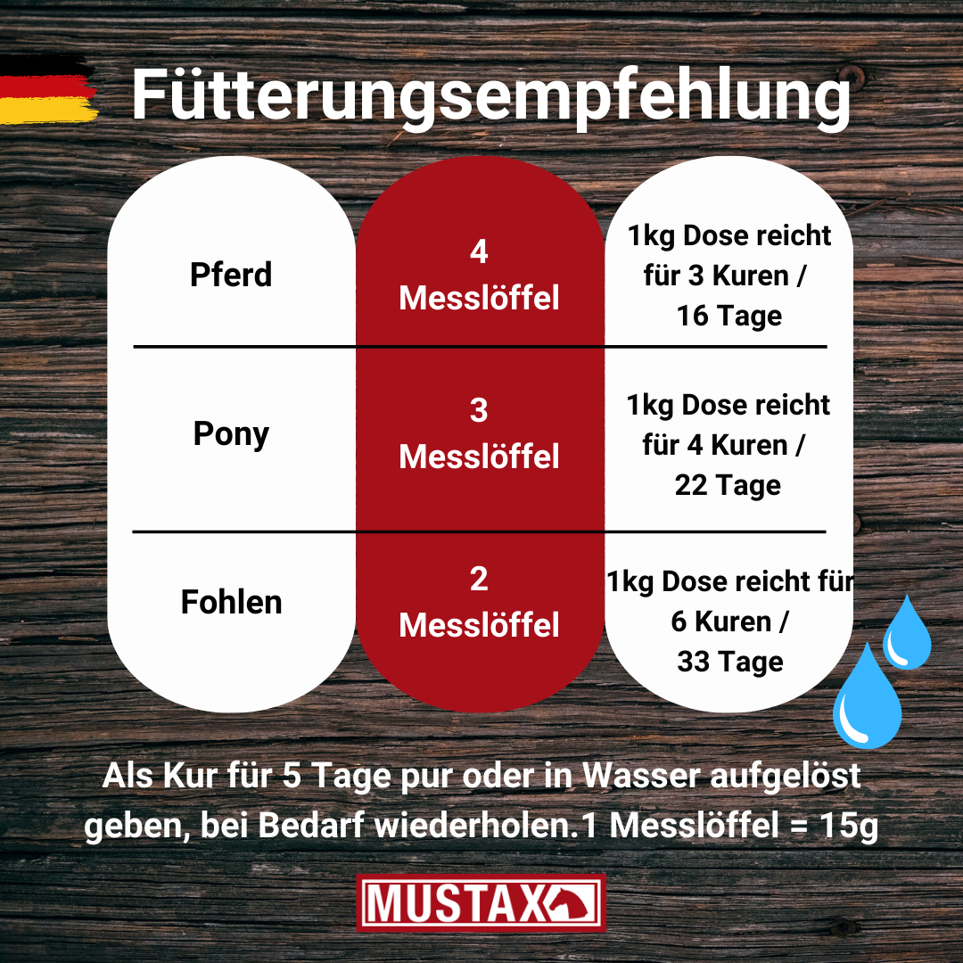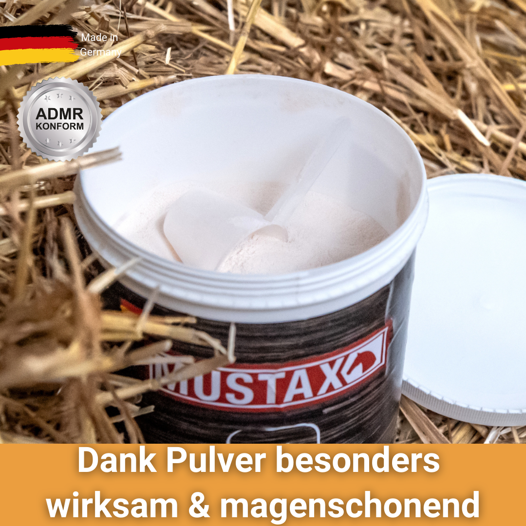 MUSTAX ist dank unseres feinen Pulvers das effektivste Ergänzungsfutter für dein Pferd, höchstverdaulich und schonend für den Magen.
