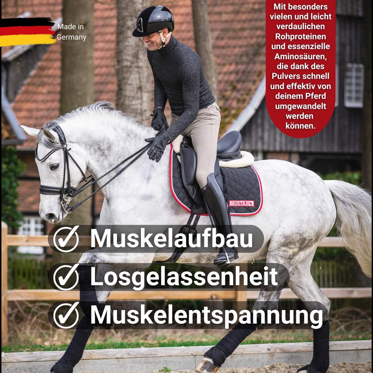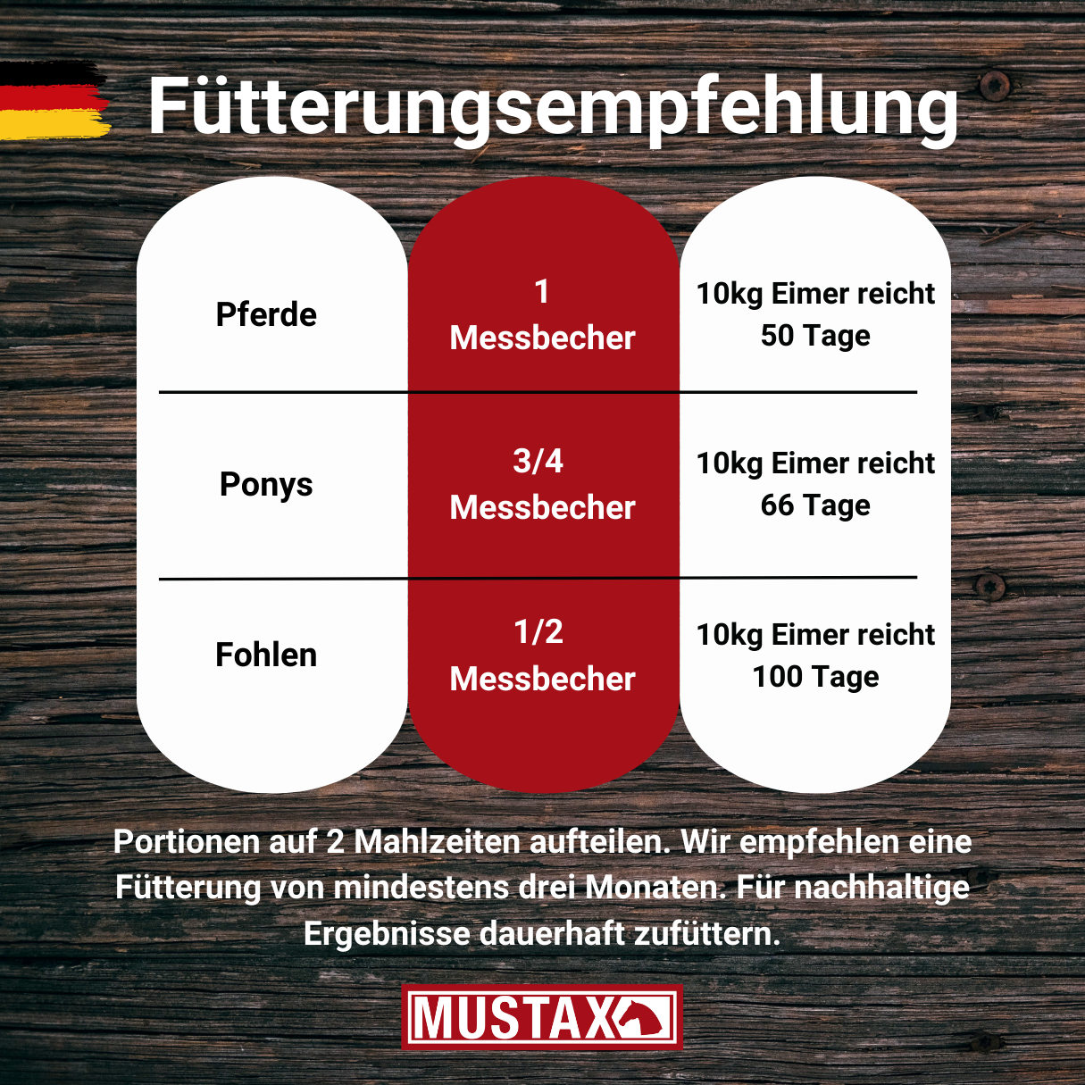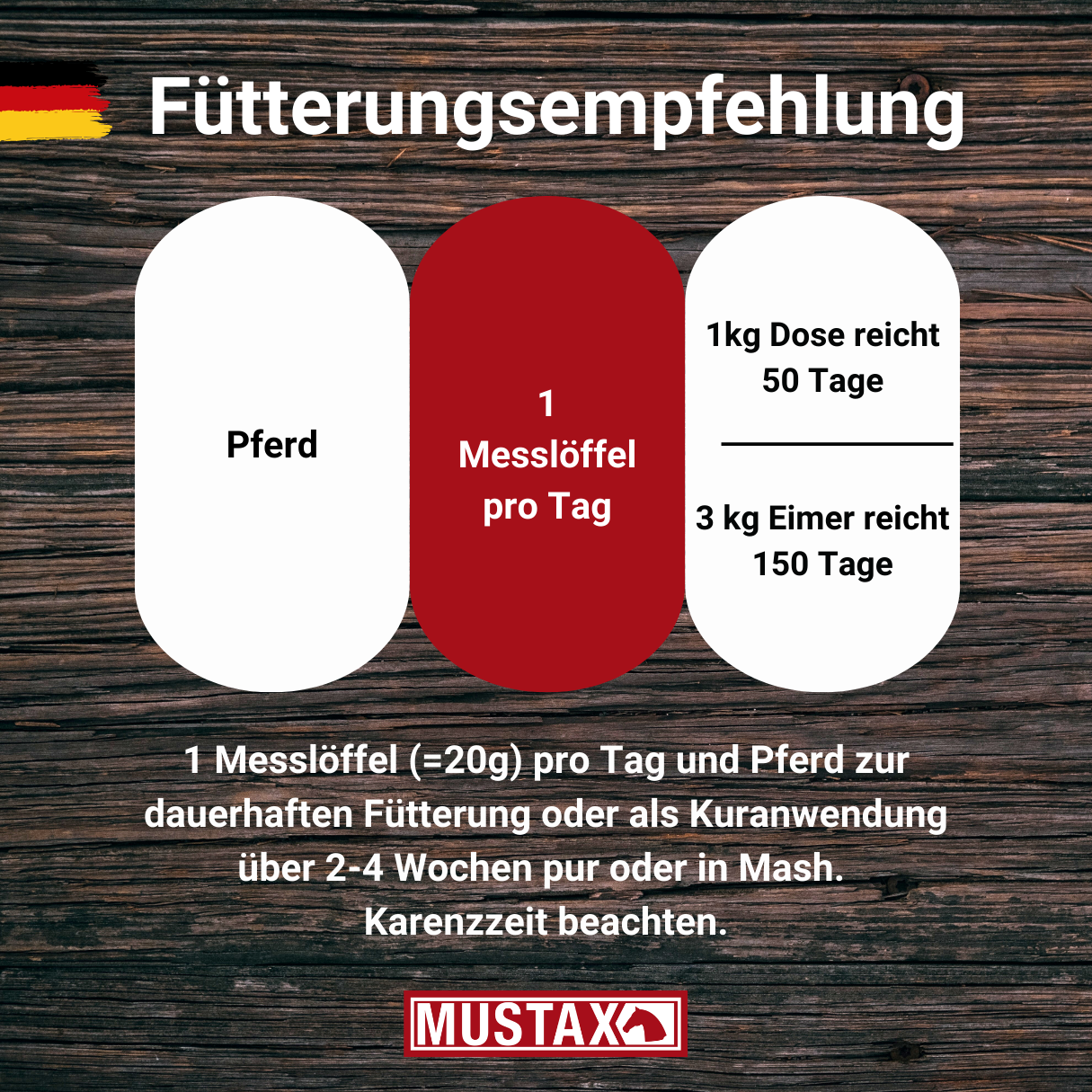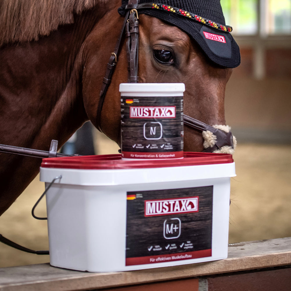 MUSTAX VIT bietet eine perfekt abgestimmte Mischung aller wichtigen Vitamine in optimaler Dosierung mit Vitamin A, D3, E, C, B1, B2, B6 und B12, unterstützt damit die Immunabwehr, Kondition und Vitalität deines Pferdes und beugt Vitaminmangel wirksam vor.