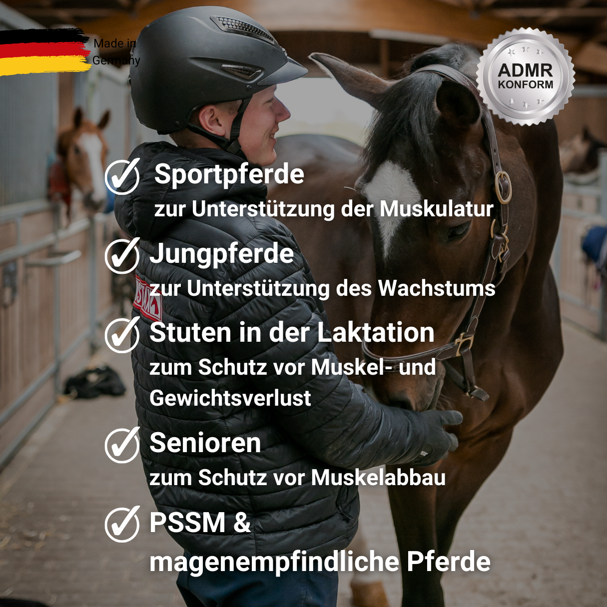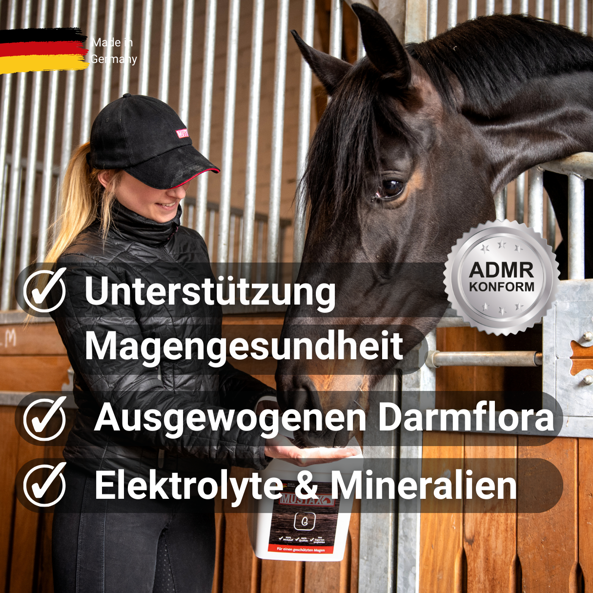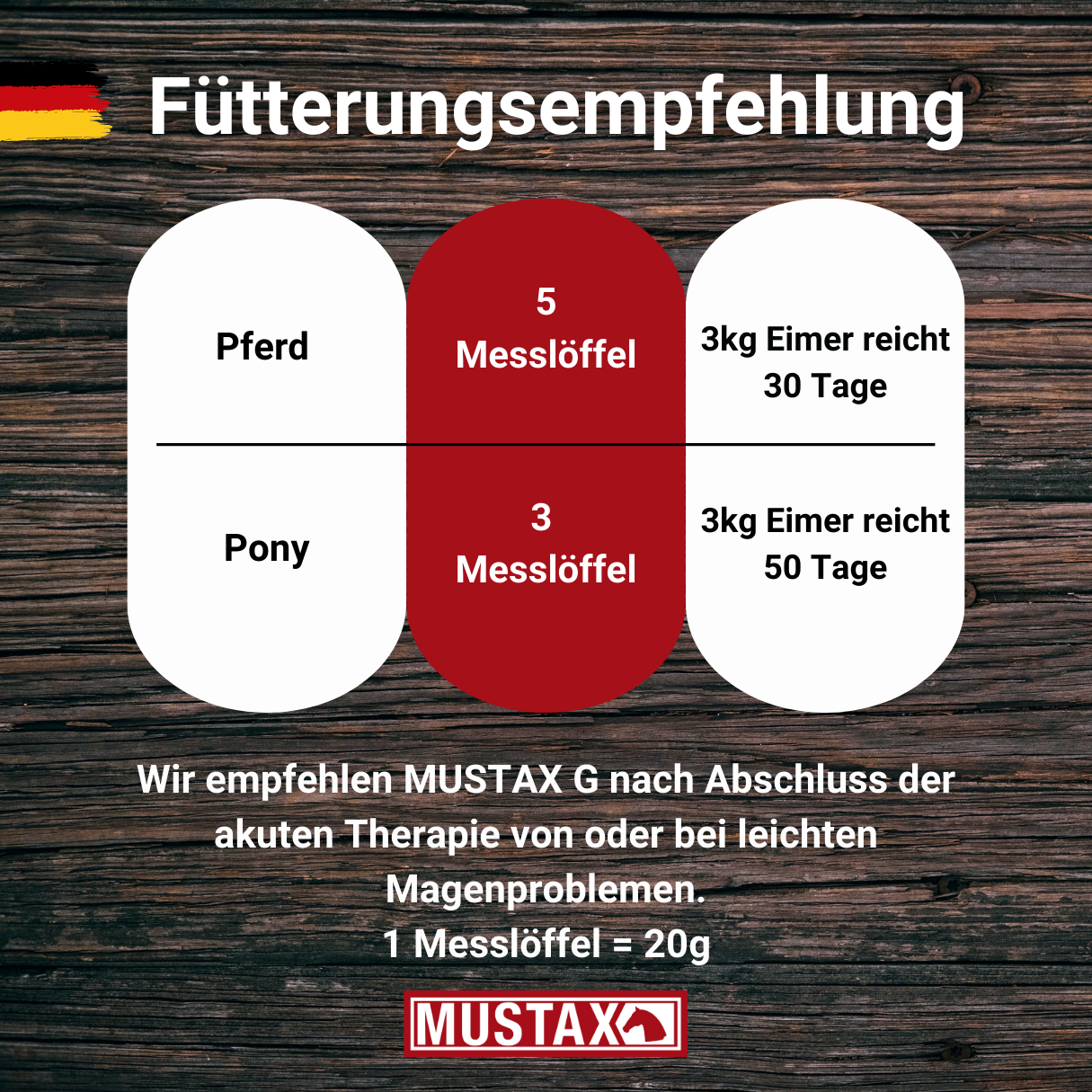 MUSTAX VIT bietet eine perfekt abgestimmte Mischung aller wichtigen Vitamine in optimaler Dosierung mit Vitamin A, D3, E, C, B1, B2, B6 und B12, unterstützt damit die Immunabwehr, Kondition und Vitalität deines Pferdes und beugt Vitaminmangel wirksam vor.